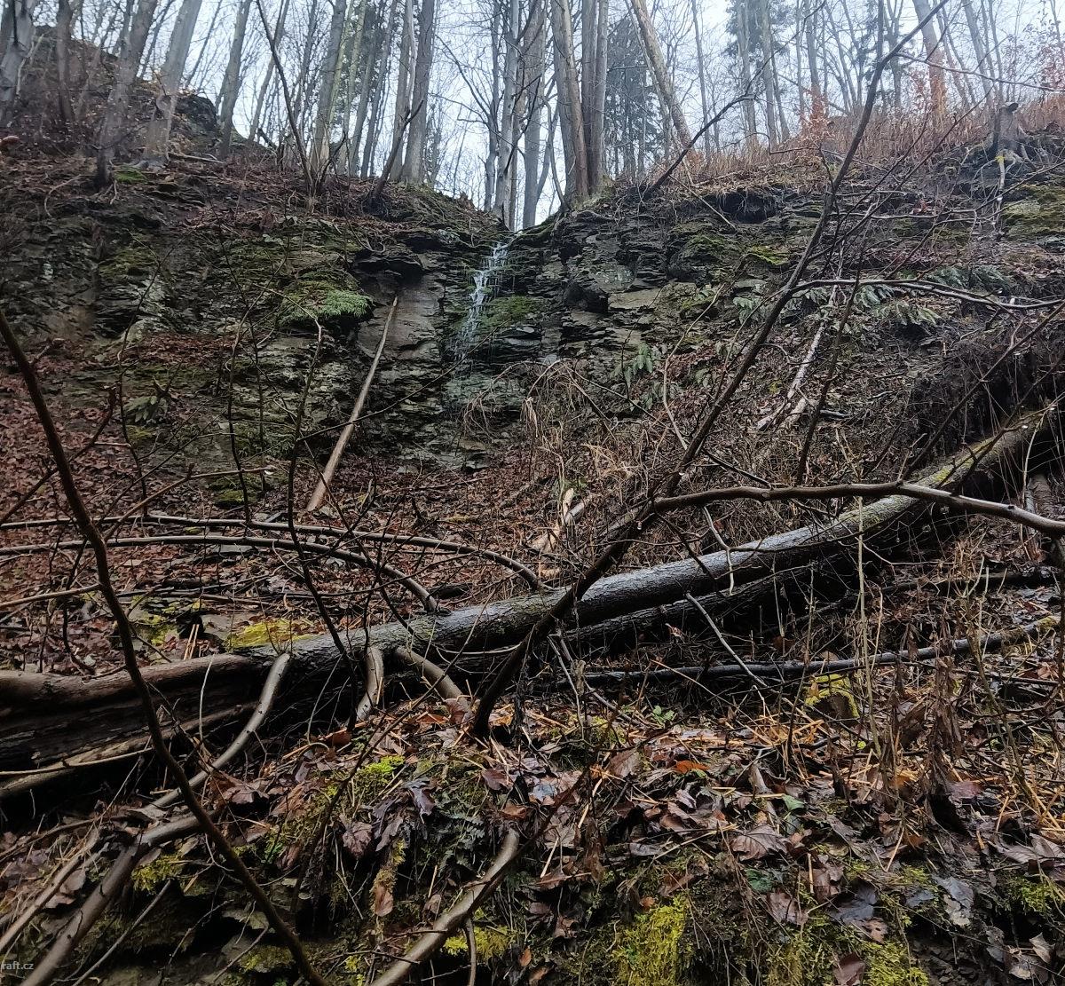 V dolní části Pekelského údolí, těsně za ostrovem se stromy leží v peřeji přes celou řeku padlý stro ...