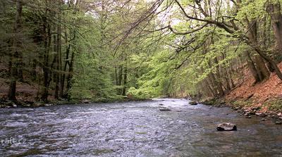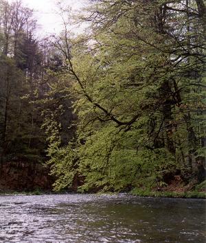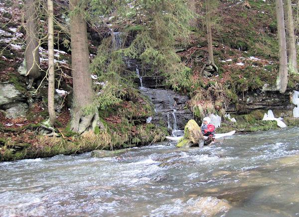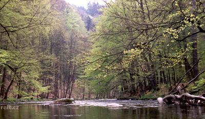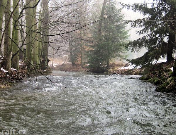 V dolní části Pekelského údolí, těsně za ostrovem se stromy leží v peřeji přes celou řeku padlý stro ...