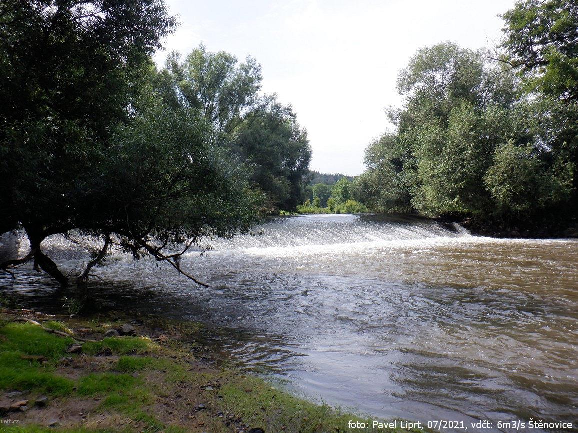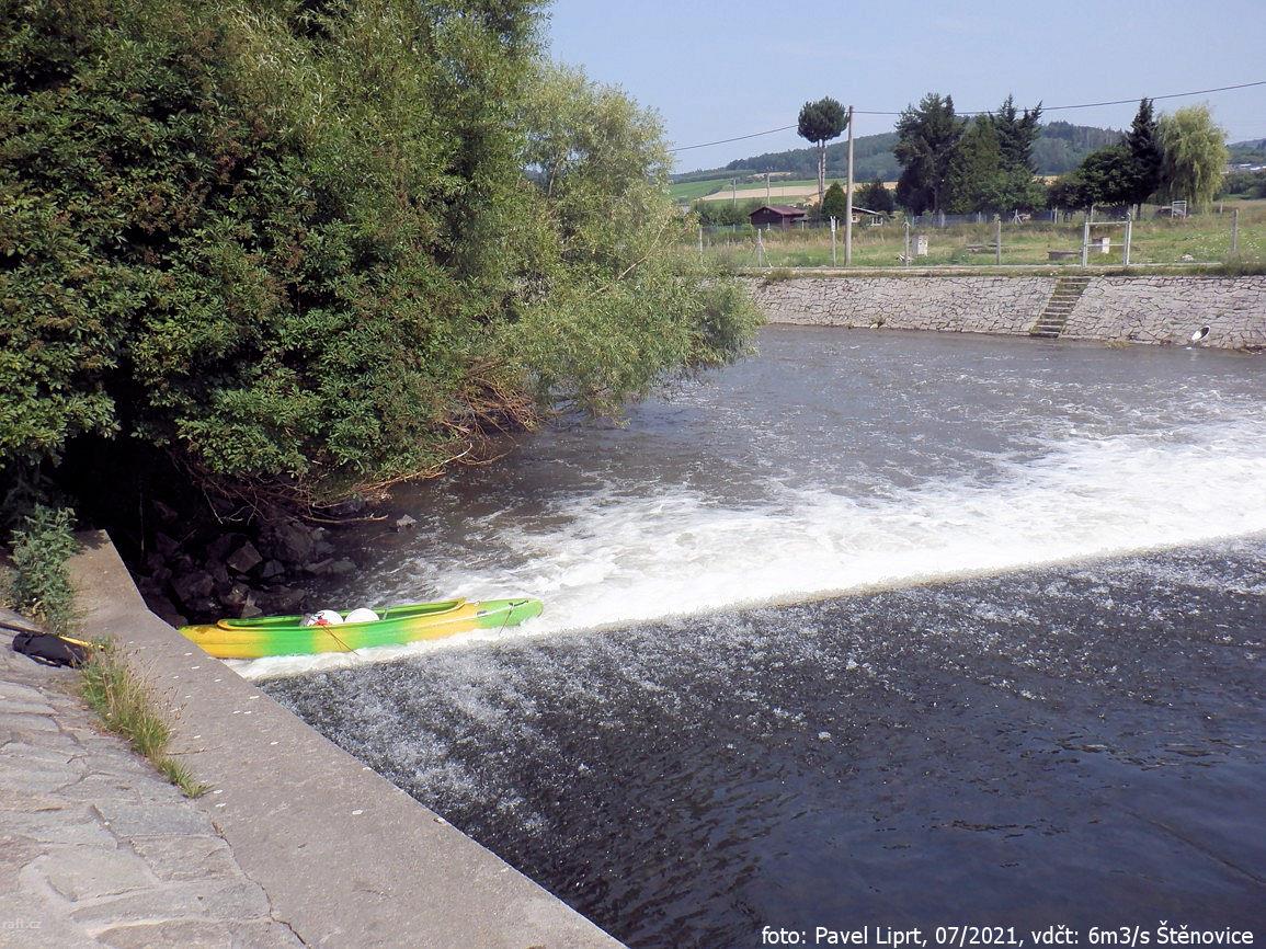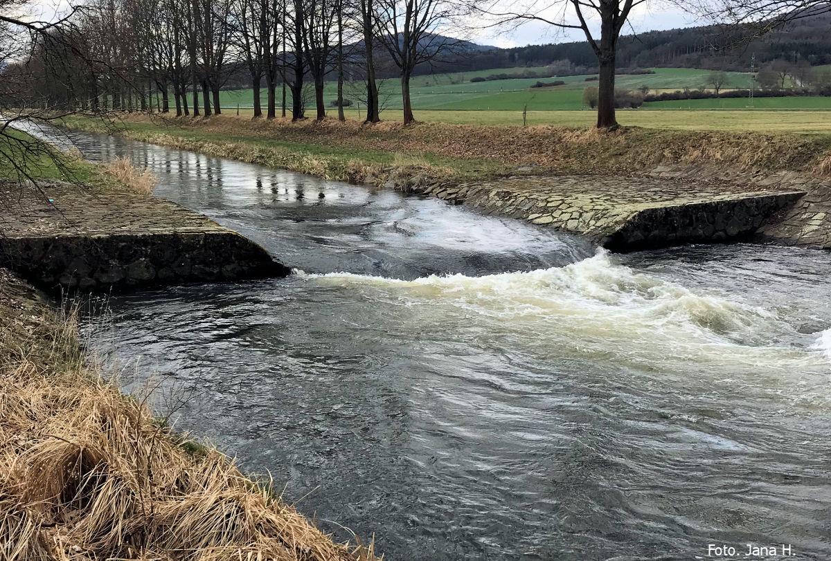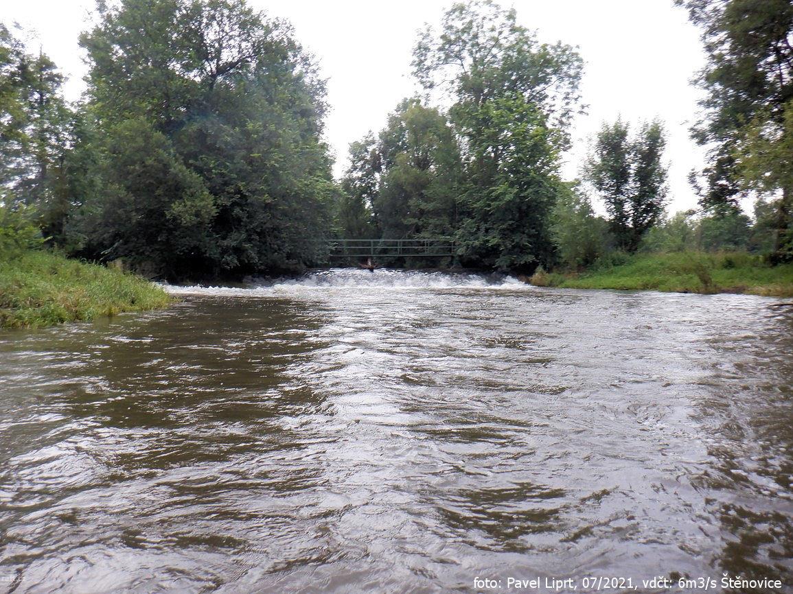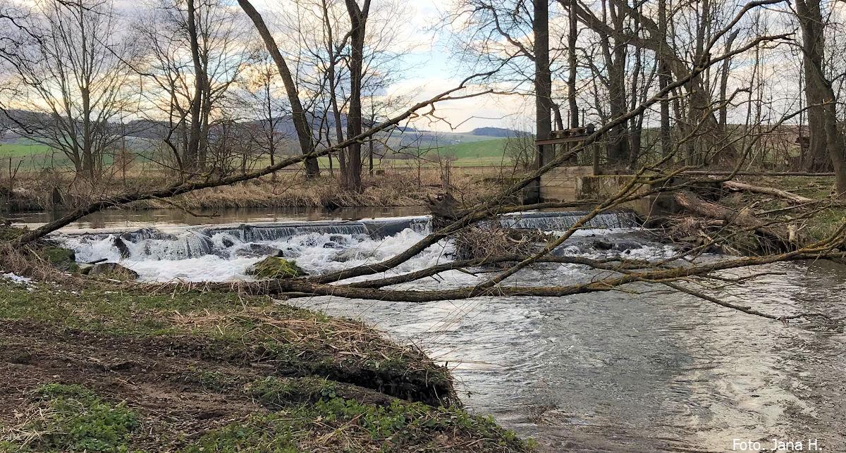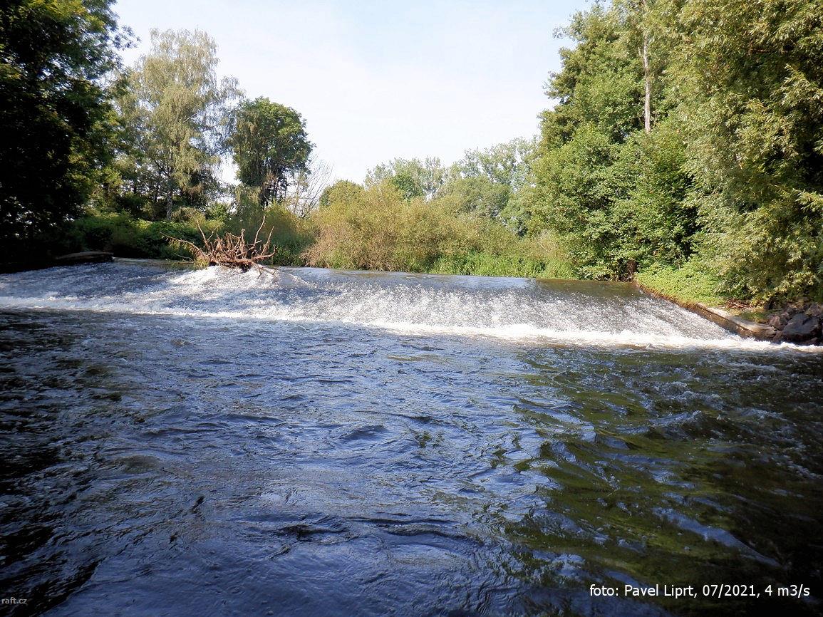 r.km 68,0 Poborovice - jez 22.3.2020, MZP= 1,02 m3/s, spád jezu je 1,95 m