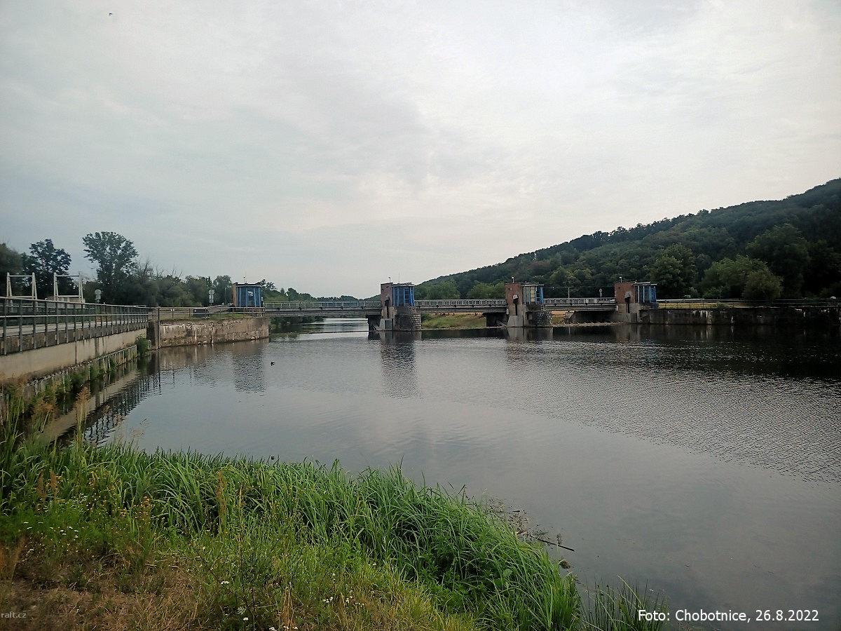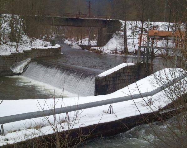 jez Bohdíkov, na koruně jezu je nově klapka, vpravo náhon do MVE a pod ním rybí přechod už poměrně b ...