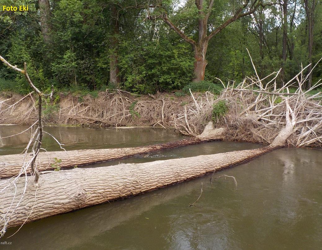 Mohutný padlý kmen přes celou řeku, cca na 21,3 km - mezi kamenným záhozem a Štěňkovem. Je to za zat ...